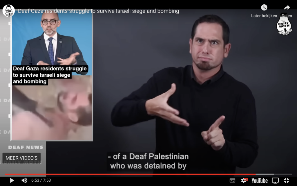 Er circuleert een video waarin een dove Palestijn geboeid op de grond ligt terwijl soldaten om hem heen staan. De Wereldfederatie van Doven (WFD), onder leiding van President Joseph Murray, heeft op 10 oktober een video gepubliceerd waarin hij benadrukt dat deze situatie ontoelaatbaar is. Hij kan niet communiceren met de soldaten doordat zijn handen worden vastgehouden, en het is van groot belang dat soldaten zich bewust zijn van zijn dove status. Hij zegt ook dat het WFD richtlijnen heeft voor bescherming en veiligheid van doven in gewapende conflicten. De beelden kunnen schokkend zijn. WFD telt 134 aangesloten landen. Palestina is een van deze leden, maar Israël maakt hier geen deel van uit. Het filmpje van de dove man op de grond kwam van de lidorganisatie van Palestina. WFD probeert contact te leggen met beide landen om de veiligheid van de dovengemeenschap te waarborgen en hen te beschermen. “Daily Moth” een Amerikaanse nieuwsorganisatie, zoals DNieuws hier in Nederland, heeft enkele video’s getoond van dove Palestijnen die in Gaza wonen. Zij proberen te overleven met beperkte toegang tot water en voedsel, terwijl de elektriciteit regelmatig uitvalt en er voortdurend bombardementen plaatsvinden door het Israëlische leger. Er zijn nog meer video’s gepost gisteren door mensen die hun verhaal delen op Instagram: zij tonen wat er is gebeurd in Gaza. Dit zijn beelden die jullie laten zien hoe dove Palestijnen momenteel leven in Gaza. Redactie: Jaron Garrite / VGT nieuwsVertaling + revisie: Elias Stuifzand